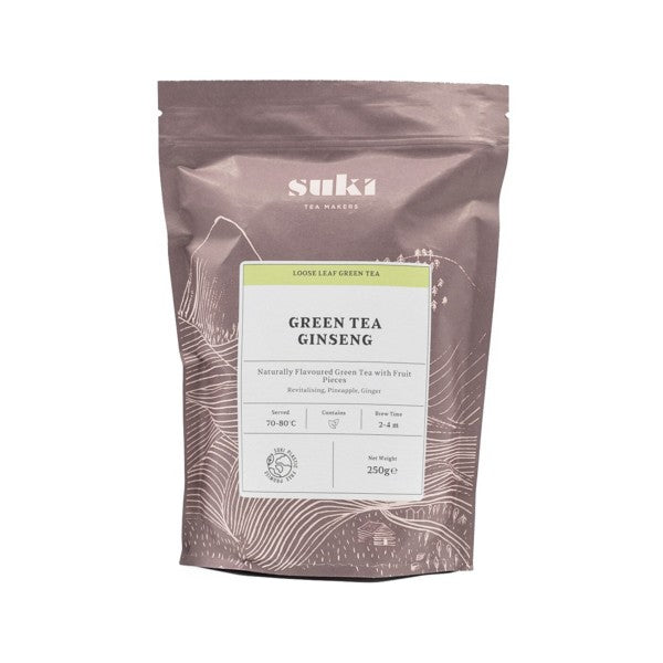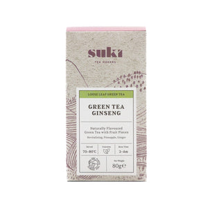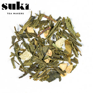 SUKI Tea presents Sencha with added ginseng: a very light, very fresh, and naturally sweet tea. A harmonious balance of ginseng, ginger, and pineapple blended with green tea leaves. Green tea with ginseng is said to naturally boost energy, aid weight loss, lower blood sugar and cholesterol levels, while also reducing stress and supporting inner calm and overall well-being.