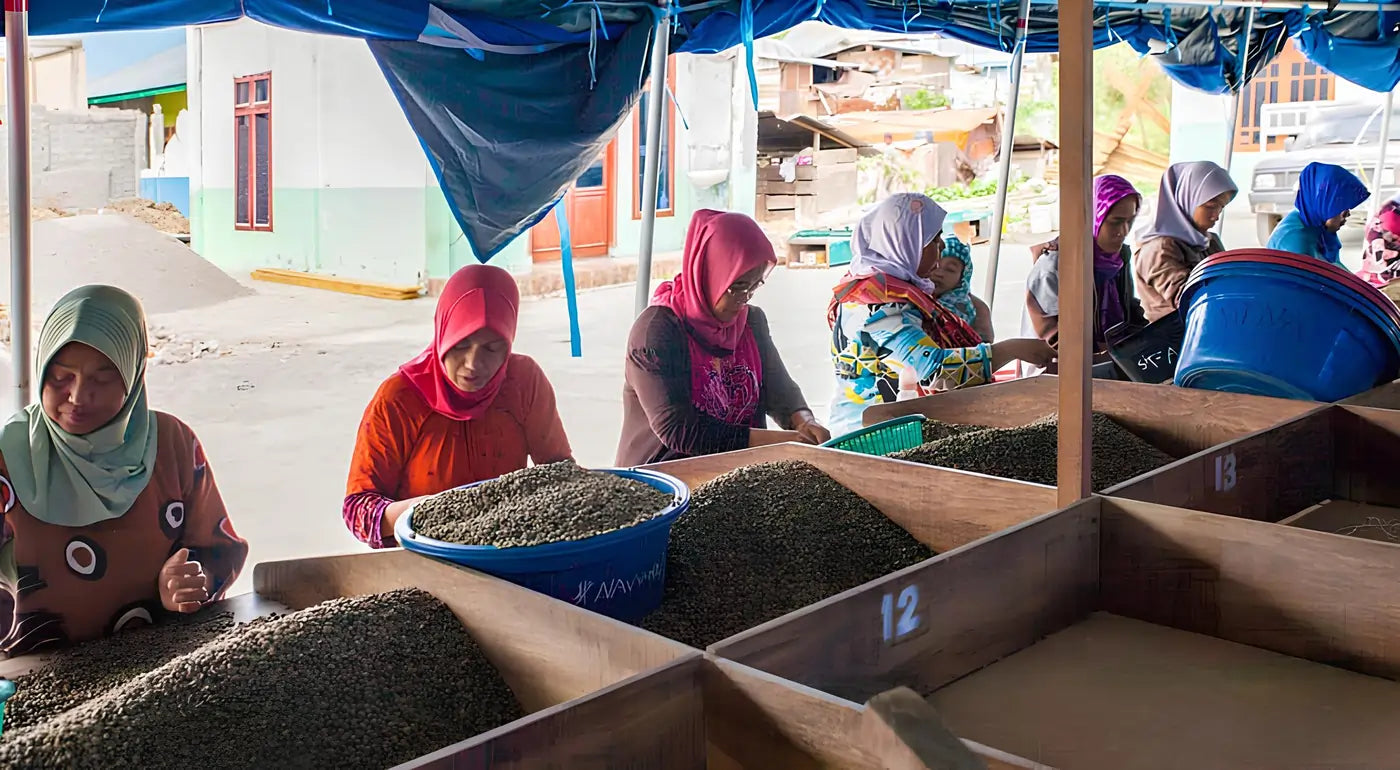 Ręczne sortowanie ziaren kawy na plantacji Buana Mandiri w Indonezji