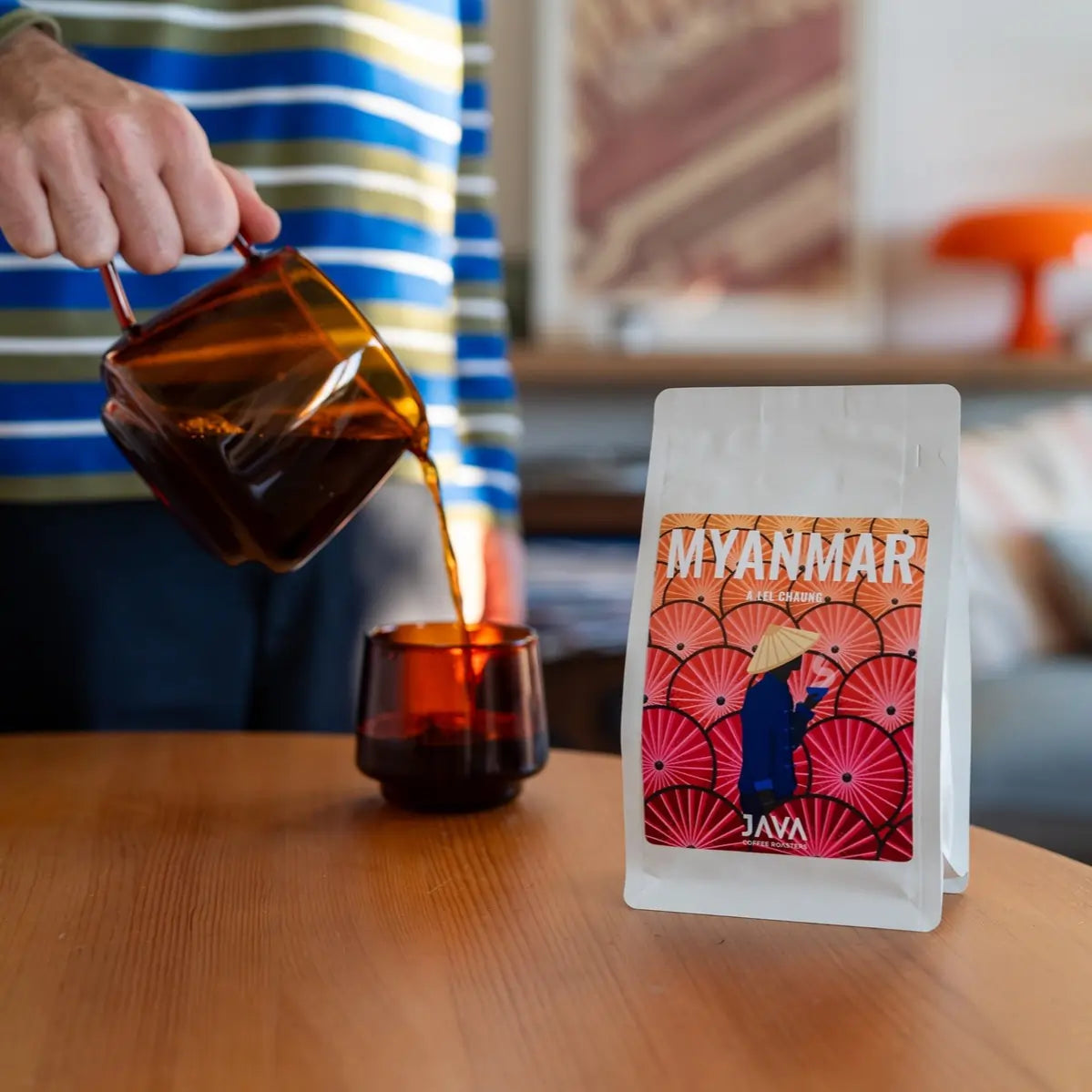 Myanmar A Lel Chaung — to kawa, która od pierwszego łyku pokazuje, że zasługuje na uwagę. I nie tylko przez jej czysty, skoncentrowany profil smakowy. To natural o wyjątkowej przejrzystości, z wyraźną wiśniową słodyczą, podbitą nutami śliwki, pomelo i przypraw korzennych – jak domowy kompot z dzieciństwa, tylko że w wersji specialty.