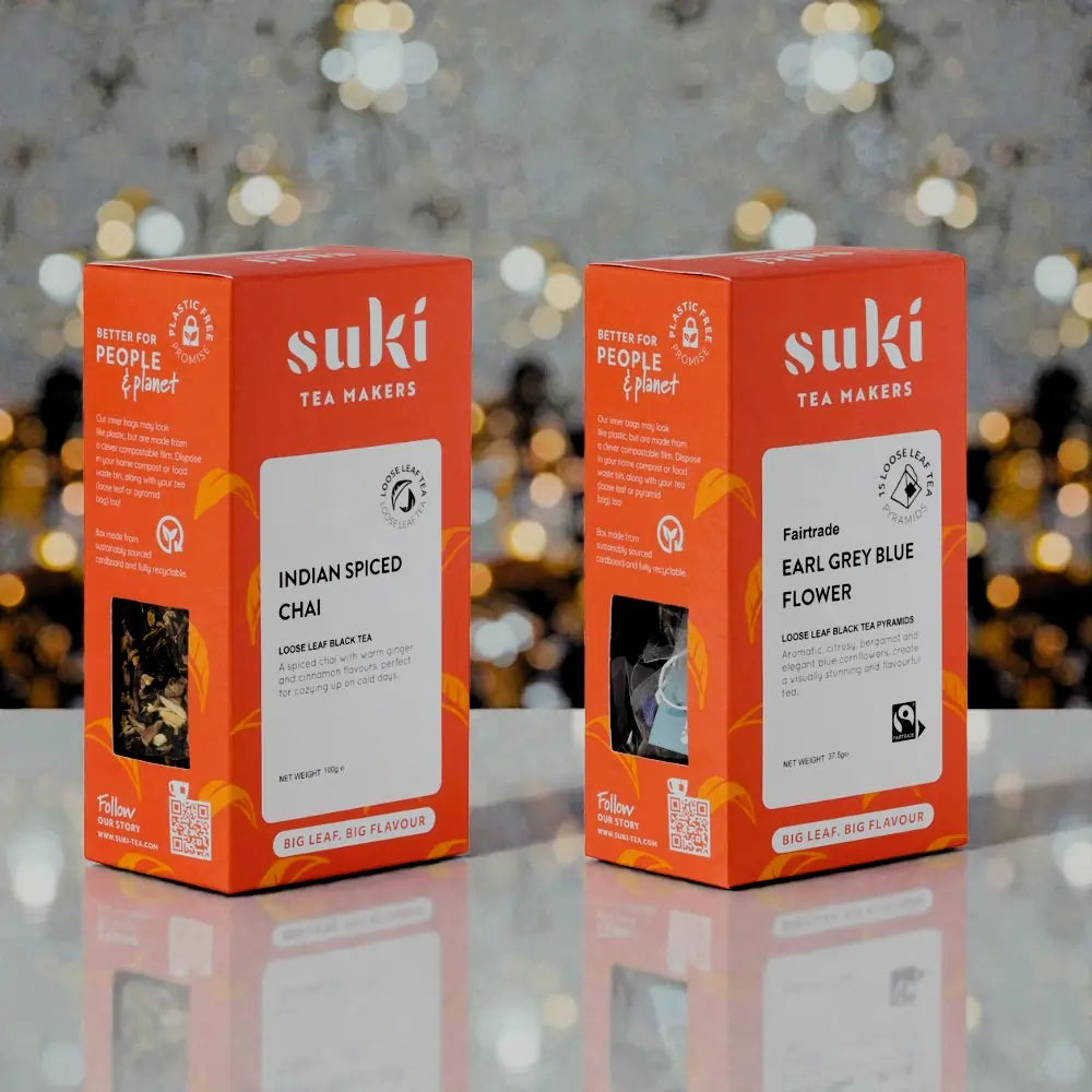Winter Tea Evening Set to zestaw czarnych herbat stworzony z myślą o zimowych wieczorach - tych spokojnych, rozgrzewających i aromatycznych. Połączyliśmy w nim dwie czarne herbaty SUKI Tea, które zimą smakują najlepiej: klasyczny Earl Grey Blue Flower z elegancką cytrusową nutą oraz głęboki, korzenny Indian Spiced Chai, idealny do słodkiego, mlecznego naparu. Całość uzupełnia gorzka czekolada Meurisse z karmelizowanymi migdałami, która pięknie dopełnia aromaty obu herbat.